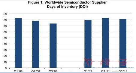 第三季度半導(dǎo)體庫存天數(shù)(DOI)為81天,比第二季度的83天下降2.5%。自從2009年第四季度以來,庫存天數(shù)就持續(xù)增加。2009年第四季度庫存天數(shù)只有67天,由于需求在衰退時期蒸發(fā),當(dāng)時庫存較低。此后,庫存天數(shù)不斷攀升,如圖1所示。庫存上升,一方面是因為需要補充衰竭的庫存,同時也是為了滿足不斷增長的需求。第三季度庫存約為369.6億美元,低于第二季度時的372.9億美元。