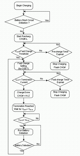 圖6所示為鋰離子電池充電器的標(biāo)準(zhǔn)充電流程,首先充電IC偵測(cè)是否有輸出短路或是過(guò)載的保護(hù)模式,若系統(tǒng)一切正常接著偵測(cè)電池初始電壓是否達(dá)到 3V以上,高于3V者就直接以快充模式進(jìn)行高電流充電,若電池低于3V者,進(jìn)入預(yù)充電模式,以快充的10%進(jìn)行充電,喚醒電池并避免電池?fù)p壞。在預(yù)充電階段,仍隨時(shí)偵測(cè)電池電壓,達(dá)到3V后可隨即切入快充模式。