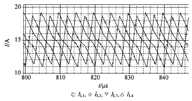 圖6 所示為濾波電感的電流波形, 從圖6 可以看出, 4 個濾波電感的電流輪流充電, 如果一個濾波電感在充電, 其余3 個電感必須在放電, 在死區(qū)時間內(nèi), 4 個濾波電感都在放電。