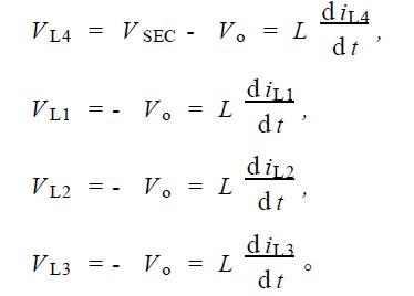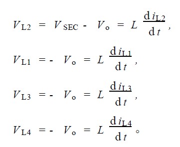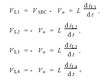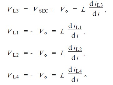 4) S2 導(dǎo)通, S1 截止; S6 截止, S3 , S4 , S5 均導(dǎo)通。由于S3 , S4 , S5 的導(dǎo)通, 第二變壓器副邊繞組上端為零電位,第一變壓器副邊繞組上、下端均為零電位, 電感L4 上電流上升, L1 , L2 , L3 上電流下降。