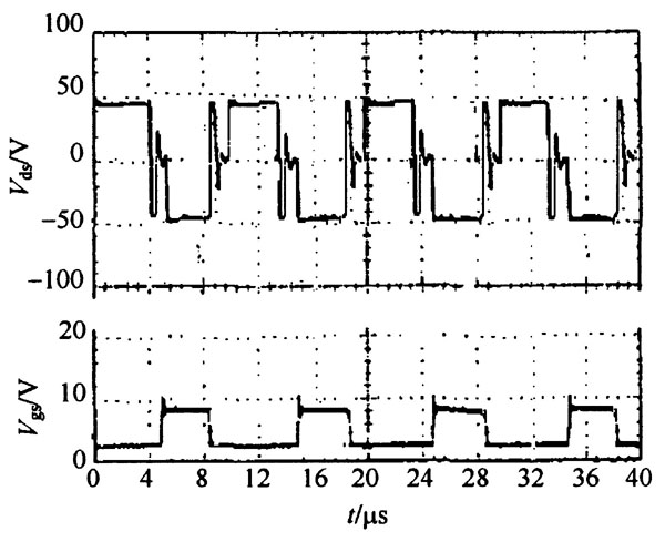 通過理論研究及仿真分析, 可以看出, 交錯并聯(lián)的低壓大電流DC - DC 變換器具有良好的性能,在輸出為1125 V/ 60 A 的情況下, 輸出電流紋波可以降到很小。為了進一步說明這種拓撲結(jié)構(gòu)的可行性, 用實驗結(jié)果驗證。實驗電路見圖4 , 實驗參數(shù)和仿真相同, 最后得到如圖9 所示的實驗波形。圖9 中, V gs為一次側(cè)一個MOSFET 的門極驅(qū)動電壓波形, V ds則為相應(yīng)的MOSFET 的柵源電壓波形,從圖9 可以看出, 實驗結(jié)果所得波形同圖5 的理論分析結(jié)果十分吻合, 所提出的方法是可行的。其中, 變壓器選用R2 KB 軟磁鐵氧體材料制作的GU22 磁心, 原副邊的匝數(shù)分別為8 匝和1 匝; 電感選用寬恒導(dǎo)磁材料IJ 50h 制作的環(huán)形鐵心T5 - 10 - 215 ,匝數(shù)為8 匝。