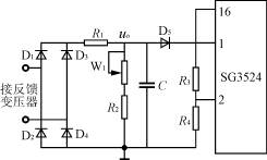 反饋調(diào)壓電路圖如圖7所示。當(dāng)逆變器正常工作時,逆變器的輸出信號接反饋變壓器,其二次電壓經(jīng)整流,濾波,分壓得到反饋電壓uo,顯然,uo的大小正比于逆變器的輸出電壓。調(diào)節(jié)W1可調(diào)節(jié)負(fù)反饋電壓的大小,從而調(diào)節(jié)逆變器輸出電壓的幅值。uo控制信號被送到SG3524-1芯片的誤差放大器的反相端腳1。誤差放大器的同相端腳2接參考電平。這樣,SG3524的輸出脈沖的占空比就受到反饋信號的控制。調(diào)節(jié)過程是這樣的,當(dāng)逆變器輸出因突加負(fù)載而降低時,它會使加在SG3524-1的腳1的輸入反饋電壓下降,這會導(dǎo)致SG3524-1輸出脈沖占空比增加,從而使得Boost電路輸出電壓升高,逆變橋的直流電壓升高,逆變器輸出交流電壓升高。反之亦然。可見,正是通過SG3524-1的脈寬調(diào)制組件的控制作用,實現(xiàn)了整個逆變器的輸出自動穩(wěn)壓調(diào)節(jié)功能。