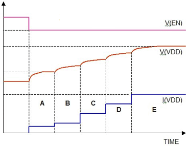 在A部分,通過限制流過分?jǐn)嚅_關(guān)的電流來(lái)減少負(fù)載電容充電時(shí)的浪涌電流;在B部分,升壓轉(zhuǎn)換器的開始電流限制在25%;在C部分,電流限制設(shè)在50%;在D部分電流限制為75%;在E部分,電流限制為100%。