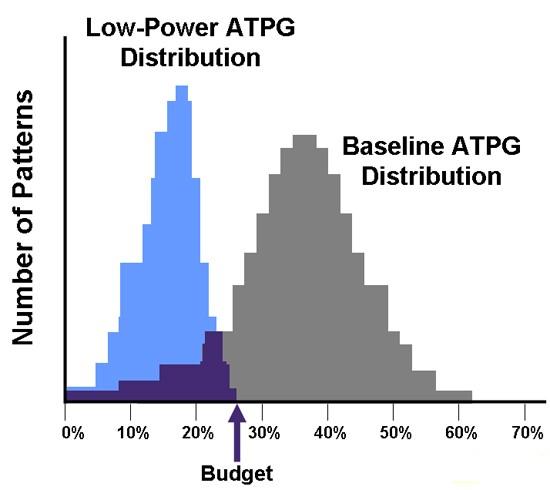 然而,如果我們采用相關(guān)技術(shù)降低測試期間的功耗,我們就能有效地將這種分布向左移。在圖1中重疊的藍(lán)色低功率分布區(qū),掃描ATPG向量的峰值開關(guān)活動(dòng)沒有超過功率預(yù)算,因此降低了制造測試中功率問題產(chǎn)生的風(fēng)險(xiǎn)。