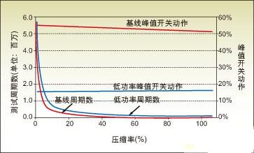 圖4:測試周期數(shù)和峰值開關(guān)動(dòng)作與壓縮率之間的關(guān)系。