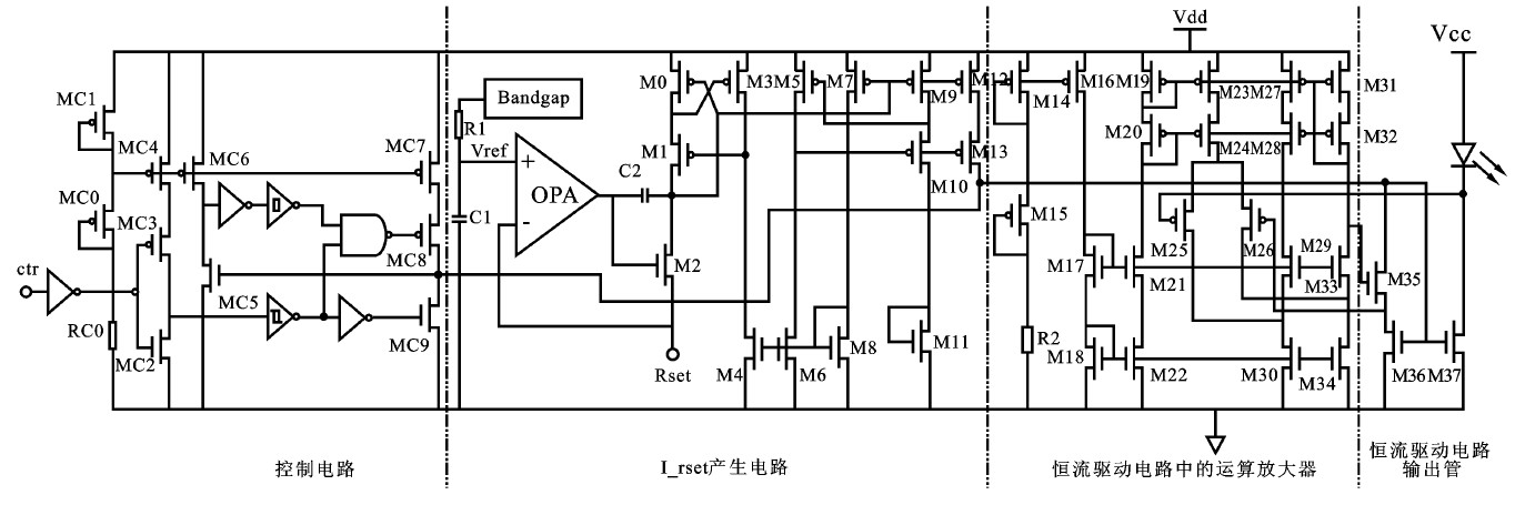 整個控制模塊利用施密特觸發(fā)器實現(xiàn)電平的準確翻轉,通過邏輯門作用于MC8、MC9.這兩個MOS管在控制信號發(fā)生翻轉時迅速將電平拉高或拉低,實現(xiàn)了對控制信號控制功能的加速作用,電路的響應速度快。當ctr信號為高時輸出禁止,ctr信號為低時輸出允許,從而實現(xiàn)利用外部的PWM信號實現(xiàn)調光功能。I_rset產生電路要實現(xiàn)通過外設電阻Rset對I_rest大小的控制,并且對與固定的Rset可以恒流輸出。利用帶隙電壓源產生一個基準電壓,利用運放實現(xiàn)基準電壓到基準電流的轉換。將運放的反相端連接到外設電阻Rset就實現(xiàn)了轉換的電流大小受控于Rset.通過后續(xù)電路將電流適當放大,最終給出I_rset.總體電路利用確立好的恒流驅動模塊實現(xiàn)恒流輸出。