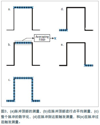 有時可以用脈沖來向器件提供功率應力。在這些應用中,在施加應力前記錄器件的狀態非常有用。這可以通過如下方法來實現:編程設定一個具有非零空置電平(idle level)的脈沖,并在觸發脈沖前先觸發測量操作(圖3d)。用戶可以規定脈沖出現前多長時間應該啟動測量。可以利用定時器來對測量的起點以及脈沖的起止點進行編程設定。
