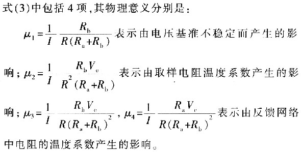 由于選取的取樣電阻R為歐姆級,而(Ra+Rb)為數十千歐姆級,因此有:μ2>μ1>μ3≈μ4,這說明影響輸出電流穩定度的主要因素是取樣電阻的溫度系數和電壓基準的穩定度。在本恒流源中,選用取樣電阻精度是0.1%,溫度系數是±2.5×10-5/℃,電壓基準的溫度系數小于1×10-6/℃。
