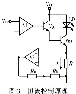為了實現高的電流穩定度,驅動電路大多采用負反饋的控制方法,恒流控制原理如圖3所示。穩流電路由基準電壓電路、電壓-電流轉換電路、恒流輸出電路和反饋電路組成。電路工作時,基準電壓經過適當放大后送入運放A1的同相端,運放A1控制VQ1基極電流的大小,從而獲得相應的輸出電流,輸出電流在取樣電阻R上產生取樣電壓,該取樣電壓經A2放大后作為反饋電壓反饋回電壓放大器A1的反相輸入端,并與同相輸入端的電壓進行比較,對輸出電壓進行調整,進而對VQ1基極的輸出電流進行調整,使整個閉環反饋系統處于動態的平衡中,以達到穩定輸出電流的目的。