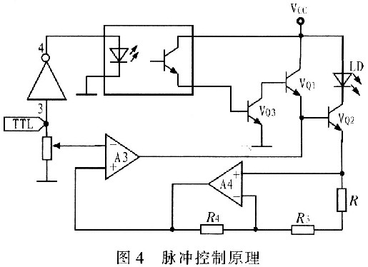 根據上述設計思想設計脈沖控制接口電路,其原理圖如圖4所示。由非門單元,晶體管VQ3,光電耦合器組成。當脈沖為高電平時,非門輸出低電壓,使光電耦合器截止,光電耦合器輸出低電平,使晶體管VQ3截止,VQ3集電極輸出高電平使VQ1、VQ2導通,LD正常工作;反之,光電耦合器導通,使VQ3導通,VQ3集電極輸出低電平,使VQl、VQ2截止,LD不工作。在沒有外控脈沖控制信號時,接口懸空,非門輸入高電平,輸出低電壓,光電耦合器不工作,晶體管VQ3截止,VQ3集電極為高電平,使VQ1導通,保證LD的正常連續發光。