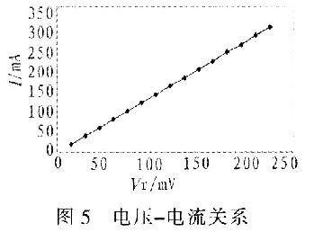 表1是該電路驅動波長650 nm,功率200 mW的LD連續工作時,基準電壓與輸出電流的測試結果,其電壓-電流關系如圖5所示。