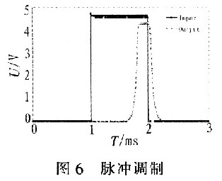 圖6顯示了該驅動電源輸出的脈沖波形。曲線Input為輸入控制脈沖信號,曲線Output為LD上電壓脈沖。結果表明:LD上電壓脈沖的上升和下降時間都很短,中間段電壓的穩定使輸出電流恒定,恒定的電流幅度保證了LD輸出功率的穩定。通過改變輸入脈沖的頻率、脈寬,可得到所需的LD激光脈沖信號。
