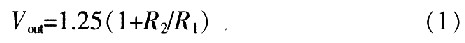LM317是美國國家半導體公司的三端可調正穩壓器集成電路,輸出電壓范圍是1.2~37 V,負載電流最大為1.5 A,使用簡單。其工作過程如下:輸出電壓Vout通過R1、VQ1,對C2充電,開始時VQ1飽和導通,Vout最低(約1.5 V)。隨著C2上電壓的升高,VQ1逐漸退出飽和并趨于截止,Vout逐漸升高至額定電壓。改變R1、C2的常數可改變軟啟動的時間。改變可變電阻R2的值,可調整輸出電壓Vout的值。VD1用于關機后使C2上的電荷快速泄放。其輸出電壓為: