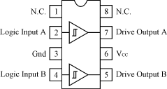 MC34152的外圍電路簡單,應用方便。它是8管腳的同相推挽驅動芯片,具體的內部結構和封裝如圖4所示。腳2與腳4為兩路控制信號輸入,經過芯片內部的推挽放大,直接輸出同相的兩路驅動信號(腳7及腳5)。為使芯片更加穩定地工作,一般在芯片的電源端并聯一個濾去高頻干擾的瓷片電容和一個濾去低頻干擾的電解電容。