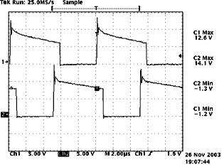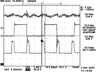 (b)圖中,示意了隔離變壓器副邊輸出的兩路驅(qū)動波形,可以直接驅(qū)動開關(guān)管。從圖中可以看出驅(qū)動波形比較理想:有快速的上升沿,并在一開始有一定的過沖,可以加速開通,減小了開通損耗;同時,有反偏截止電壓,提供了足夠的反相門極驅(qū)動,減小了下降時間;很好地驗證了驅(qū)動電路的設(shè)計是合理的。