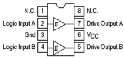MC34152的外圍電路簡單,應(yīng)用方便。它是8管腳的同相推挽驅(qū)動芯片,具體的內(nèi)部結(jié)構(gòu)和封裝如圖4所示。2,4腳為兩路控制信號輸入,經(jīng)過芯片內(nèi)部的推挽放大,直接輸出同相的兩路驅(qū)動信號(7,5腳)。為使芯片更加穩(wěn)定地工作,一般在芯片的電源端并聯(lián)一個濾去高頻干擾的瓷片電容和一個濾去低頻干擾的電解電容。