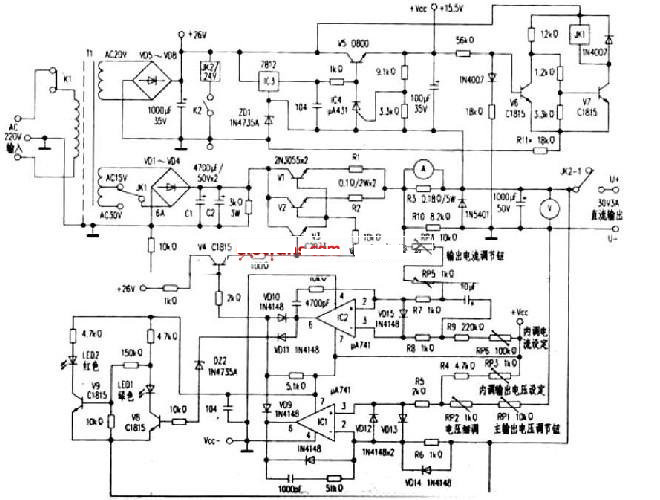 運(yùn)放IC1(μA741)及周邊元件組成穩(wěn)壓調(diào)節(jié)電路,由V1//V2、V3組成達(dá)林頓大功率電壓調(diào)整電路。RPl、RP2、RP3、R4、R5、R6、VDl2、VD13、VDl4等組成輸出電壓取樣電路,運(yùn)放IC1對(duì)輸出電壓變化進(jìn)行放大,由輸出端⑥腳經(jīng)VD10對(duì)達(dá)林頓管的基極電流進(jìn)行分流,以達(dá)到穩(wěn)壓調(diào)整目的,其中RP1、RP2為面板上的輸出電壓粗細(xì)調(diào)節(jié)電位器,RP3為電路板內(nèi)部的最高輸出電壓設(shè)定可調(diào)電阻。