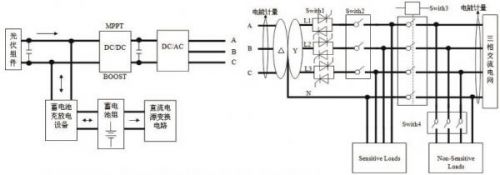 微網(wǎng)逆變器系統(tǒng)將可再生能源(如太陽能,風(fēng)能,水能,地熱能,生物質(zhì)能等)轉(zhuǎn)變?yōu)榕c電網(wǎng)同頻、同相的交流電,優(yōu)先輸送給當?shù)刎摵晒╇姡S嗟碾娔莛伻腚娋W(wǎng)。微網(wǎng)逆變器系統(tǒng)主要包括:光伏組件、蓄電池組、蓄電池充放電設(shè)備、DC/DC變換器、微網(wǎng)逆變器、靜態(tài)開關(guān)等。