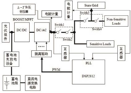 正常工作時,開關(guān)Switch1、Switch2、Switch3、Switch4同時閉合,為當?shù)刎摵商峁╇娔埽划敵霈F(xiàn)電網(wǎng)缺相、電壓嚴重跌落等非正常狀況時,由DSP檢測出異常情況,做出判斷決策,并控制開關(guān)的開通與0關(guān)斷。這時,開通Switch1和Switch2,關(guān)斷Switch3,保證重要負荷的供電。當逆變器發(fā)生故障時,立即斷開Switch1,逆變器退出,同時斷開Switch4,由電網(wǎng)對重要負荷供電。當逆變器故障消失時,在與電網(wǎng)同步后,開通Switch1,再閉合Switch4,恢復(fù)對當?shù)刎摵傻墓╇姟.斝枰獧z修逆變器時,先斷開開關(guān)Switch2,檢修完成后,重新閉合Switch2。