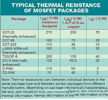 例如,采用1平方英寸的銅片,D-Pak的ΘJAD-Pak可能是50°C/W。但如果銅片就設(shè)在封裝引腳下,ΘJA值將會加倍(參見表)。采用多個并聯(lián)MOSFET,ΘJA主要依賴于它所安裝的銅片面積。兩個元器件的等效ΘJA可能是只有一個元器件時的一半,除非銅片的面積加倍。就是說,增加并聯(lián)MOSFET而不同時增加銅片面積,將使RDS(ON)減半,但對ΘJA的改變小得多。