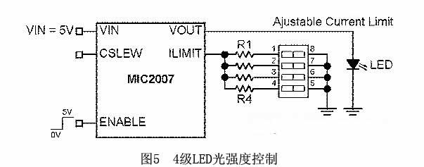 MIC2007可以在開關開啟且LED已點亮之后調節限流值。而通過改變限流值,就可以動態調節LED的光強度。如圖5所示,有4個電阻器連接到Ilimit管腳。