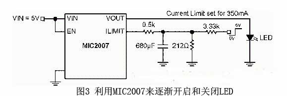 圖2展示的是輸出和LED相連的配電開關。MIC2007可以在2.5V-5.5V的輸入電壓下工作。它是通過外置電阻器Rset來設定限流值的。限流值等于CLF/Rset,CLF為限流因數,一般是245(請參考MIC2007數據表暨電氣性能表),而Rset 則等于0.7 kΩ。因此,限流值就是245/0.7 kΩ = 350 mA。