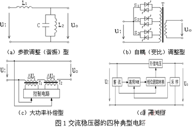 由于我國(guó)交流電網(wǎng)的電壓波動(dòng)較大,特別是邊遠(yuǎn)農(nóng)村地區(qū),交流穩(wěn)壓電源已成為許多電子設(shè)備不可缺少的供電裝置[1]。按照工作原理,交流穩(wěn)壓電源可分為參 數(shù)調(diào)整(諧振)型[2]、自耦(變比)調(diào)整型[3]、大功率補(bǔ)償型[4、5]和開關(guān)型[6、7]等四種類型,其典型電路如圖1所示?!?nbsp;