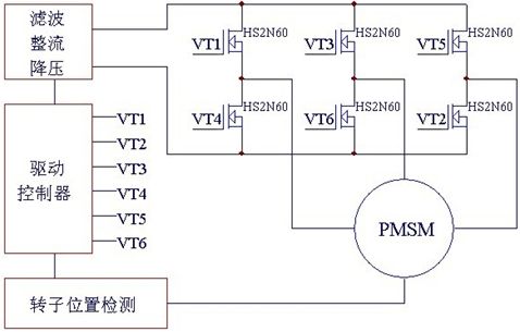 方案中無(wú)刷直流電機(jī)(BLDCM)輸入(110V/220V)交流電,經(jīng)轉(zhuǎn)換器(converter)轉(zhuǎn)成直流,要轉(zhuǎn)入電機(jī)線圈前須先將直流電壓由換流器(inverter)轉(zhuǎn)成3相電壓來(lái)驅(qū)動(dòng)電機(jī)。換流器(inverter)由6個(gè)功率MOSFET(VT1~VT6)分為上臂(VT1、VT3、VT5)/下臂(VT2、VT4、VT6)連接電機(jī)作為控制流經(jīng)電機(jī)線圈的開關(guān)。MCU提供PWM(脈沖寬度調(diào)制)決定功率MOSFET HS2N60IB開關(guān)頻度及換流器(inverter)換相的時(shí)機(jī)。