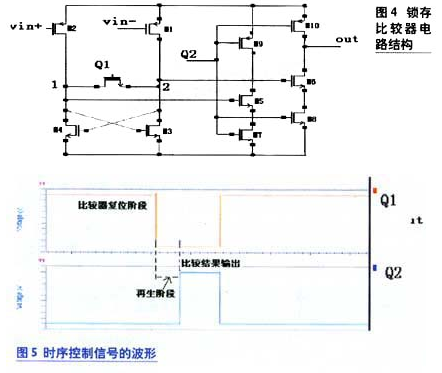 因前置放大器的增益與輸入電壓的乘積不足以達(dá)到輸出VOH的要求,所以把放大后的電壓再加到鎖存器上即可以得到所要求的電壓。第三級(jí)比較器的結(jié)構(gòu)采用可再生比較器,它也是使用正反饋來實(shí)現(xiàn)兩個(gè)信號(hào)的比較。可再生比較器又稱為鎖存比較器。比較器中兩相非交疊時(shí)鐘控制,確定不同的工作模式,從而實(shí)現(xiàn)比較器的復(fù)位與輸出。其電路的拓?fù)浣Y(jié)構(gòu)如圖4所示。其中兩相非交疊時(shí)鐘Q1和Q2的波形如圖5所示。