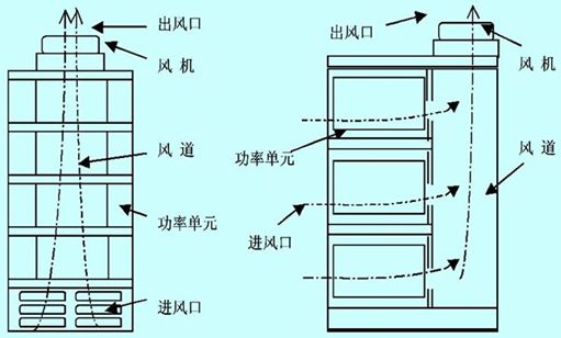 高壓變頻器常風的冷卻方式主要為散熱器強制風冷、循環(huán)水冷卻和熱管冷卻等。因強制風冷方式簡單,不存在水冷時的凝露問題,以及熱管散熱器設(shè)計的復(fù)雜性,在確定合適的通風結(jié)構(gòu)的情況下,一般采用此種方式。采用強制風冷方式需要在結(jié)構(gòu)設(shè)計時考慮散熱風道。散熱風道的設(shè)計應(yīng)在充分考慮單元散熱的要求下,應(yīng)盡量優(yōu)化。常見的多電平串聯(lián)方式的高壓變頻器,從結(jié)構(gòu)上分為功率柜體、變壓器柜、控制柜。功率柜風道設(shè)計通常有兩種方式:串聯(lián)風道和并聯(lián)風道。