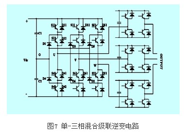 除了上述的聯(lián)結(jié)方式以外,還有由一個三相三電平二極管箝位逆變器或飛跨電容型逆變器和三個單相h橋逆變器串聯(lián)形成的三相級聯(lián)逆變器。這種電路結(jié)構(gòu)簡單,控制也易于實現(xiàn),實際中已有使用。圖7為單-三相混合級聯(lián)逆變電路圖。