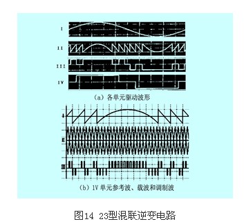 本方法主要針對非對稱混聯(lián)逆變電路。為了實現(xiàn)輸出電壓波形的連續(xù)調(diào)幅,需要對多電平電路進行pwm控制。同時為了降低脈沖階躍幅度帶來的電磁干擾,連續(xù)調(diào)幅時產(chǎn)生的脈沖不超過1v。圖14為23型3級h橋非對稱混聯(lián)逆變電路(三個級聯(lián)單元的直流電壓比為1:2:4)的混合pwm調(diào)制方法示意圖。首先對電壓為2v和4v單元按圖14(a)中的iii、iv波形進行驅(qū)動,然后將i中正弦調(diào)制波和iii、iv波形相減,得到1v單元的調(diào)制波ii。再用ii和三角載波進行調(diào)制,形成1v單元的pwm驅(qū)動波形,如圖14(b)所示。顯然,該法只對1v單元進行了pwm調(diào)制,因此在選擇器件時,就可以在2v和4v單元使用低頻大功率器件,如igct;而在1v的pwm單元采用高頻小功率器件。
