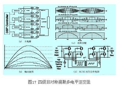 有些學(xué)者為非對稱混聯(lián)多電平逆變電路提出了主從逆變單元的概念。主逆變單元(master)就是串聯(lián)連接的逆變器中,直流電壓最高的單元,它承擔(dān)級聯(lián)逆變器大多數(shù)的功率,通常由gto、igct完成,同時通過dc/dc雙向功率電源向從逆變單元(slave)供電。其它的逆變單元稱為從逆變單元,直流電壓較低,只負責(zé)完成自己的逆變?nèi)蝿?wù)。圖17所示為(a)(b)(c)(d)分別為4級連接81電平的逆變器主電路、輸出波形、功率分配情況及dc/dc雙向功率電源。