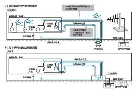 本圖為傳導噪聲的測量情形。該測量的屏蔽室內進行。具體的測量條件由“CISPR16-2”或“ANSI63-4”等規(guī)格規(guī)定。