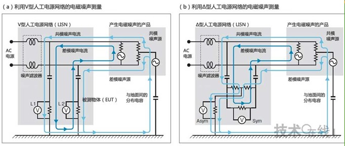 在傳導噪聲的測量中,一般針對電源線1(L1)和電源線2(L2)各自的電磁噪聲,利用V型人工電源網(wǎng)絡測量準峰值和平均值(a)。在該測量中,差模噪聲和共模噪聲合在一起,難以分辨哪種噪聲模式是主體。而如果利用Δ型人工電源網(wǎng)絡,便于分辨噪聲模式的種類(b)。該電源網(wǎng)絡可根據(jù)噪聲模式(Sym:差模,ASym:共模)測量其頻率特性。