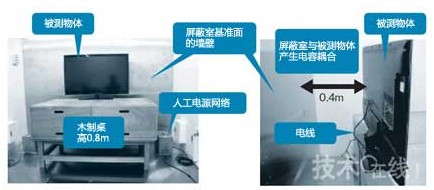傳導噪聲的測量在屏蔽室內進行。測量條件由“CISPR16-2”或“ANSI63-4”等標準規(guī)定。兩種標準中規(guī)定,屏蔽室的基準面與被測物體的距離要保持在0.4m,連接人工電源網(wǎng)絡和被測物體的電線長度為0.8m,被測物體設置在高0.8m的臺子上(圖5)。