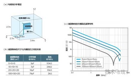 利用尺寸各異的4種對象物進行了電磁場解析模擬,計算出了從人工電源網(wǎng)絡觀察被測物體時的共模阻抗(a)。根據(jù)結果可知,形狀越大,屏蔽室基準面與被測物體的分布電容越大,共模路徑的阻抗就越低(b)。另外,頻率越高,共模阻抗越低(c)。