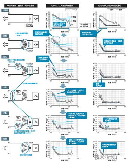 作為噪聲水平較高的共模噪聲對策,①安裝了標準的共模扼流圈(3mH)。這樣做雖然共模噪聲大幅衰減,但差模噪聲并沒有衰減,因此低頻帶范圍的電磁噪聲依然高于規(guī)定值。