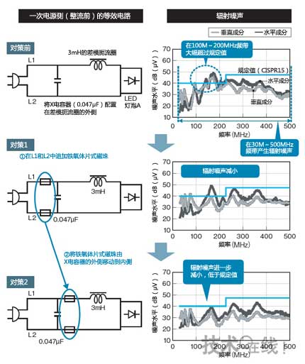 抑制輻射噪聲的最佳元件配置因LED燈泡而異。在其他LED燈泡中,盡管采取了獲得出色結果的圖11的②那樣的配置,即在X電容內側配置片式鐵氧體磁珠,但并未獲得同樣出色的效果。所以又將片式鐵氧體磁珠安裝到X電容外側,此時,輻射噪聲降到了規(guī)定值以下(圖12)。也就是說,對于每一個LED燈泡而言,即便使用相同的噪聲對策元件,其效果也是不同的。