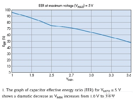 從設計角度看,超級電容和電池的根本區別在于電容器在充/放電周期發生的顯著電壓變化。充電時,理論上,電容器的電壓從零上升到其最高額定電壓,而電池的端電壓在其工作周期中變化很小。超級電容是電子電容器的一個子集??赏ㄟ^下式得出能從超級電容放電周期中(放電周期是指電容器的端電壓從其最大值VMAX變為最低工作電壓VMIN的過程)獲得的有效能量EEFF: