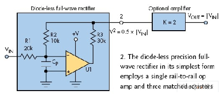 在滿足等式3的條件下,電路在點2具有1/2的增益。可添加一個增益為2的非反相放大器以得到一致的整體增益,從而實現工作等式VOUT=|VIN|?! ?br />