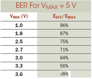 其中EMAX代表電容器存儲的總能量。等式2明確表明,隨著我們通過減少電容器內的駐留電能,而降低了被供電電路的最低工作電壓VMIN,有效能效比可獲得極大地提升。對任何以電容供電的電路來說,能效比都是一個非常重要的設計考慮?! ?br />