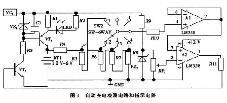 如圖4電路所示,自動斷電電路是由三極管VT2、電壓跟隨器A1、電壓比較器A2電阻R4、R5、R6、R7、R8、R11和可變電阻RP1構成。當充電開始時,電壓比較器輸出高電平,VT2導通,VT1也導通,指示燈發光二極管亮,給電池充電。可以先設定轉換開關為1時給一節電池充電,轉換開關為2時給二節電池充電,依次類推,實現對1-4節電池充電。當電充滿時,電壓比較器輸出低電平,VT2截止,VT1不導通,發光二極管熄滅,充電完畢。[page]