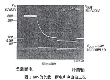 “冷曲軸”(cold crank)段,發生在汽車發動機經受冷卻或凝固期間,發動機油變的非常粘滯。因而要求起動機輸出更大的轉矩,相繼需要蓄電池提供更大的電流。這一大的電流負載導致蓄電池/一次母線的電壓降低,甚至低于4V的點火電壓。隨后,又回復至額定電壓13.8V(圖1)。這在某些應用場合,例如發動電機控制、安全系統和導航系統均不可避免。故要求具有良好調節的輸出電壓(一般為3.3V)貫穿“冷曲軸”段,以實現全過程的無間斷(連續)運行。