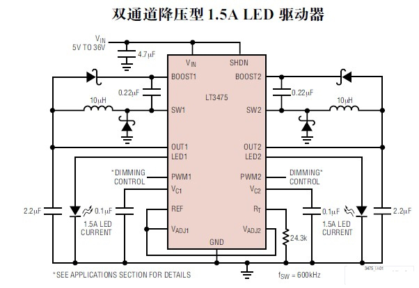 LTC3475以其寬的輸入電壓范圍(4V~36V,max40V),可調節含汽車動力系統在內的廣闊的電源陣列。它的開關頻率調節幅度為200kHz~2MHz,能利用很小的電感器和陶瓷電容器,與耐熱的TSSOP-16組件結合,在驅動2個或4個大電流LED時,可提供結構非常緊湊的解決方案。