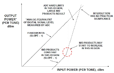 類似地,信號(hào)每增加1 dB,三階IMD (IMD3)幅度就增加3 dB,如圖中slope = 3 曲線所示。