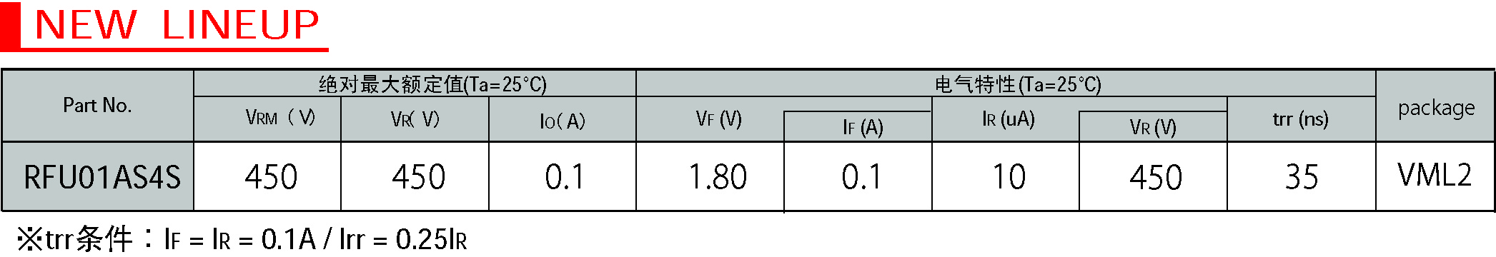 這次,羅姆通過改善結構設計和裝配工藝使封裝得到優化,成功開發出了世界最小的“VML2”封裝(1006尺寸∶1.0mm×0.6mm)快速恢復二極管。與傳統的2513尺寸(2.5mm×1.3mm)相比,體積減少約86%。不僅體積小巧,高達450V耐壓特性也是其特長之一。