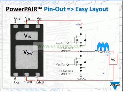 這種器件的另一個好處是布線。從圖2中可以看到,封裝的引腳使其能很容易地集成進降壓轉換器設計方案中。更特殊之處在于,器件的輸入是在一側,輸出在另一側。引腳2和3與DC-DC電路的VIN相對應,是高邊MOSFET的漏極。小焊盤也是高邊元器件的漏極焊盤。較大的焊盤是電路的開關節點的焊盤更大,在這個地方,高邊MOSFET的源極合低邊MOSFET的漏極在內部連到器件上。這個節點會連到電感器。最后,接地是引腳4和5,是低邊MOSFET的源極。引腳1和6 分別連到高邊和低邊MOSFET的柵極。這種布線很簡單,而且減少了用兩個器件時發生布線錯誤的幾率。把多個器件組合在一起時需要額外的PCB走線,這種布線還能減少與此種PCB走線相關的寄生電感: