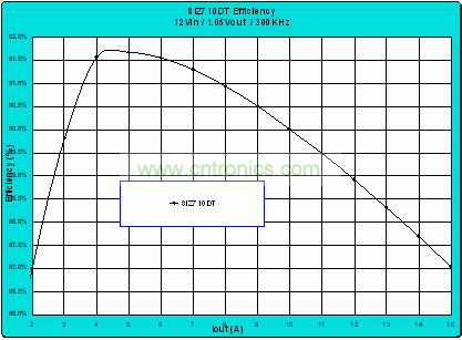 改用較小外形尺寸雙芯片功率封裝的最后一個好處是能夠實現的效率可以幫助提高功率密度。器件安裝在單相降壓轉換器評估板上,條件如下。