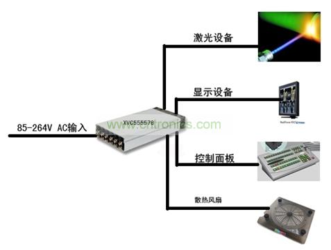 設(shè)備總功率約為1,100W,滿足醫(yī)療設(shè)備認(rèn)證,需要四組不同直流輸出,首先是大電流的48V、20A用于激光設(shè)備, 其次需要一個(gè)18V用于LCD顯示器,再次需要一個(gè)5V用于控制面板,最后還需要一個(gè)12V用于系統(tǒng)散熱風(fēng)扇。這個(gè)客戶找了很多品牌的產(chǎn)品都無法定型,因?yàn)殡娫聪到y(tǒng)太復(fù)雜,價(jià)格太高,占用的空間太大,最后他選擇了Excelsys,在40.5×260×127mm(1U高)的封裝內(nèi)解決了問題。